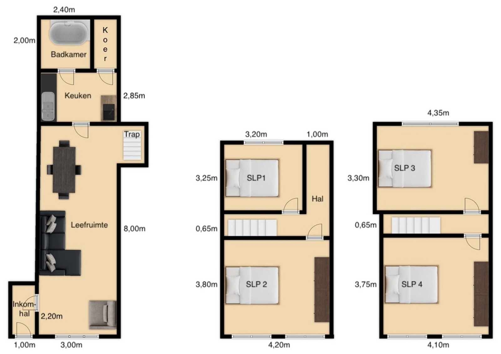 Op de eerste verdieping vinden we twee volwaardige en ruime slaapkamers. De zolderverdieping, bereikbaar via een vaste trap, werd eveneens optimaal benut met twee extra slaapkamers. Eén van deze kamers beschikt over een vide/hoogslaper, wat zorgt voor een speelse en tegelijk functionele invulling van de ruimte.