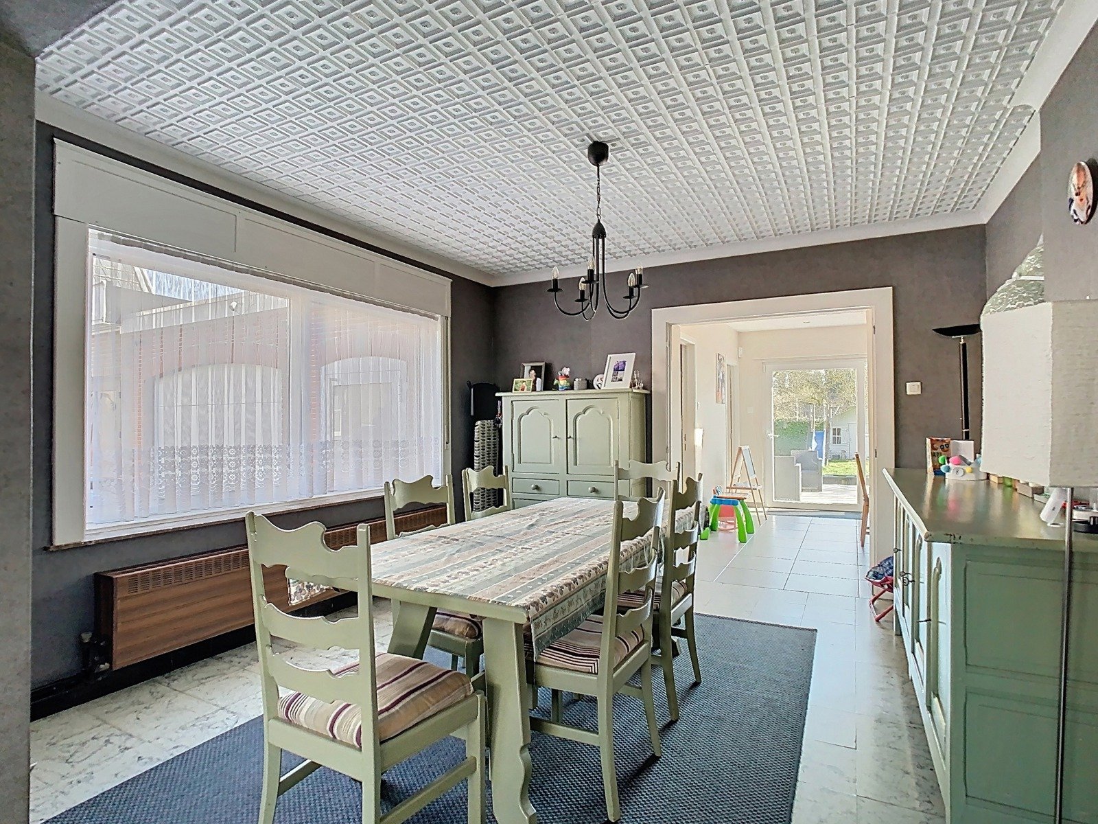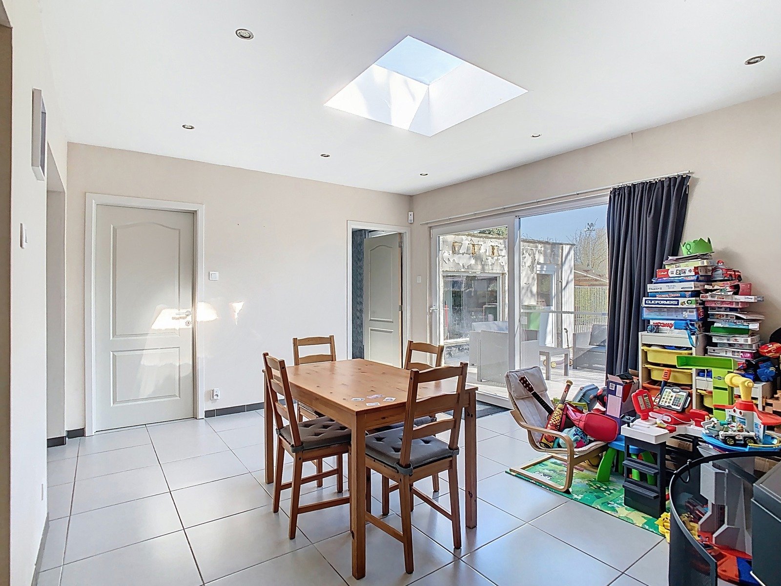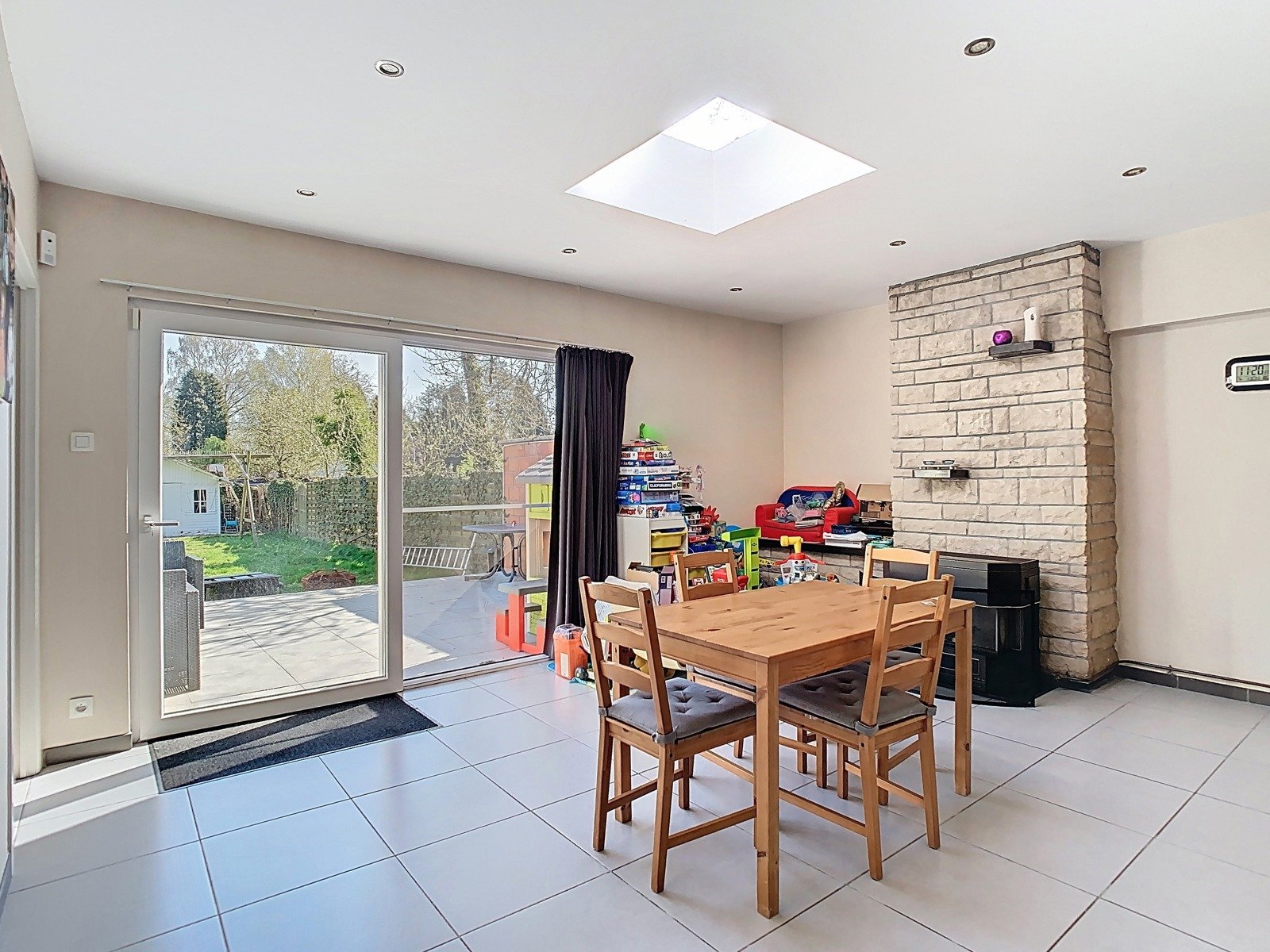 De ontbijthoek in de keuken baadt in het licht dankzij het grote schuifraam, dat uitkijkt naar het terras en de tuin – een perfecte plek om te genieten van een maaltijd of gewoon te ontspannen.
