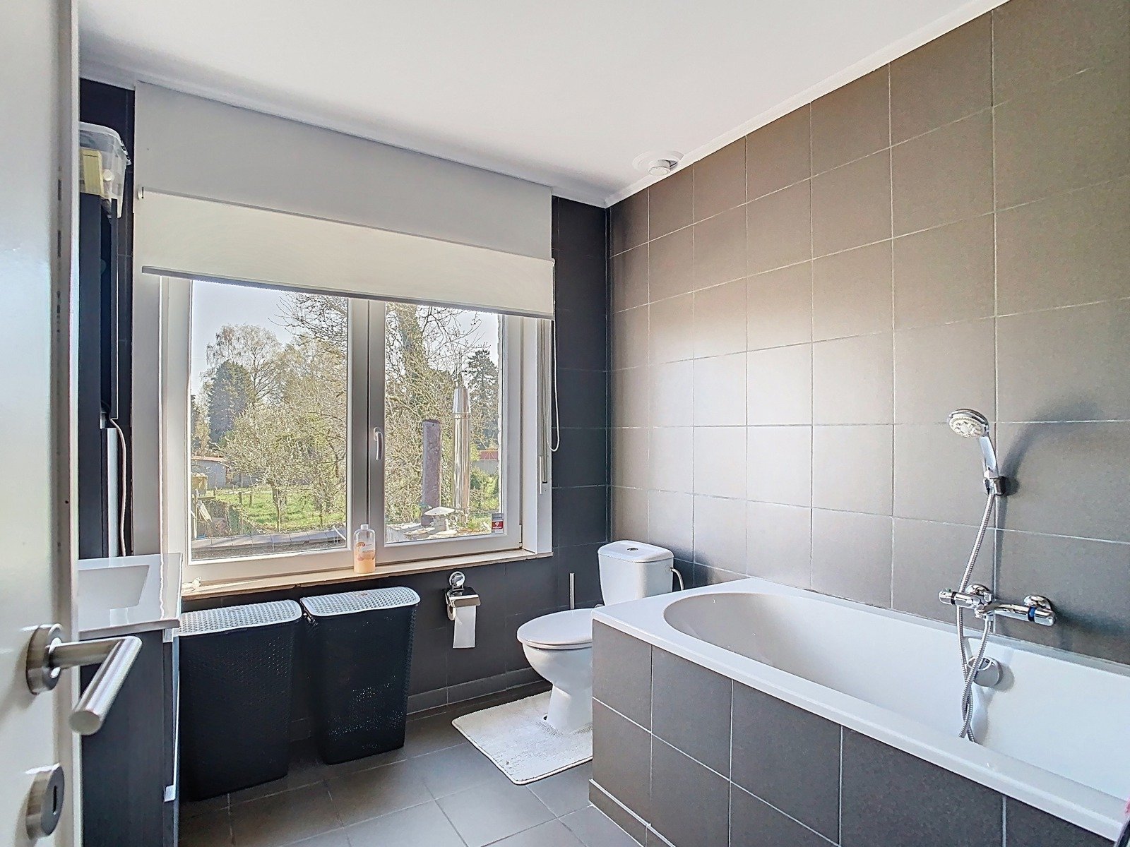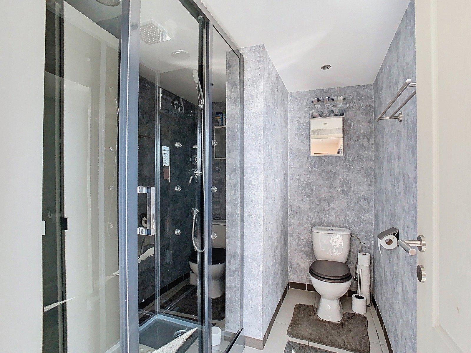 Op het gelijkvloers bevindt zich de eerste badkamer, die bereikbaar is via de keuken. Deze badkamer is uitgerust met een ruime douche en een toilet.