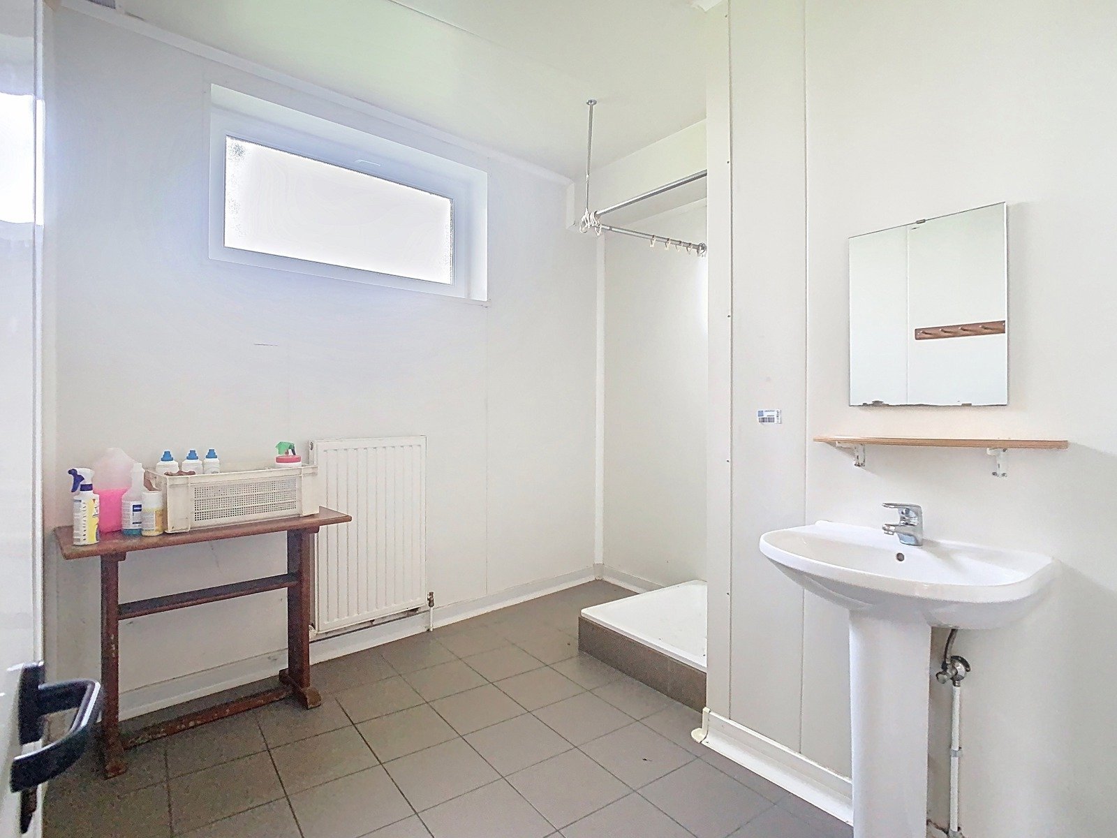 Achteraan bevinden zich 3 garageboxen met daarboven meerdere doucheruimtes (werden op vandaag gebruikt door het personeel), een apart toilet, een vergaderzaal en een zéér ruime en lichtrijke bureauruimte.