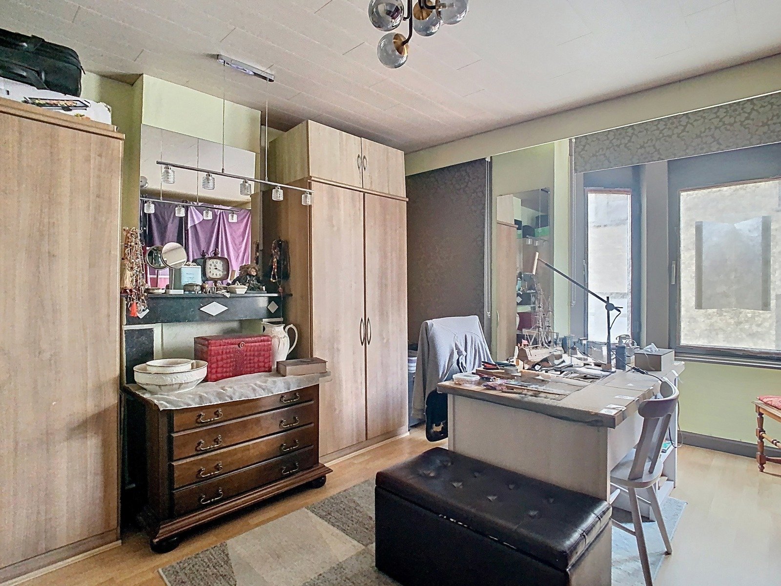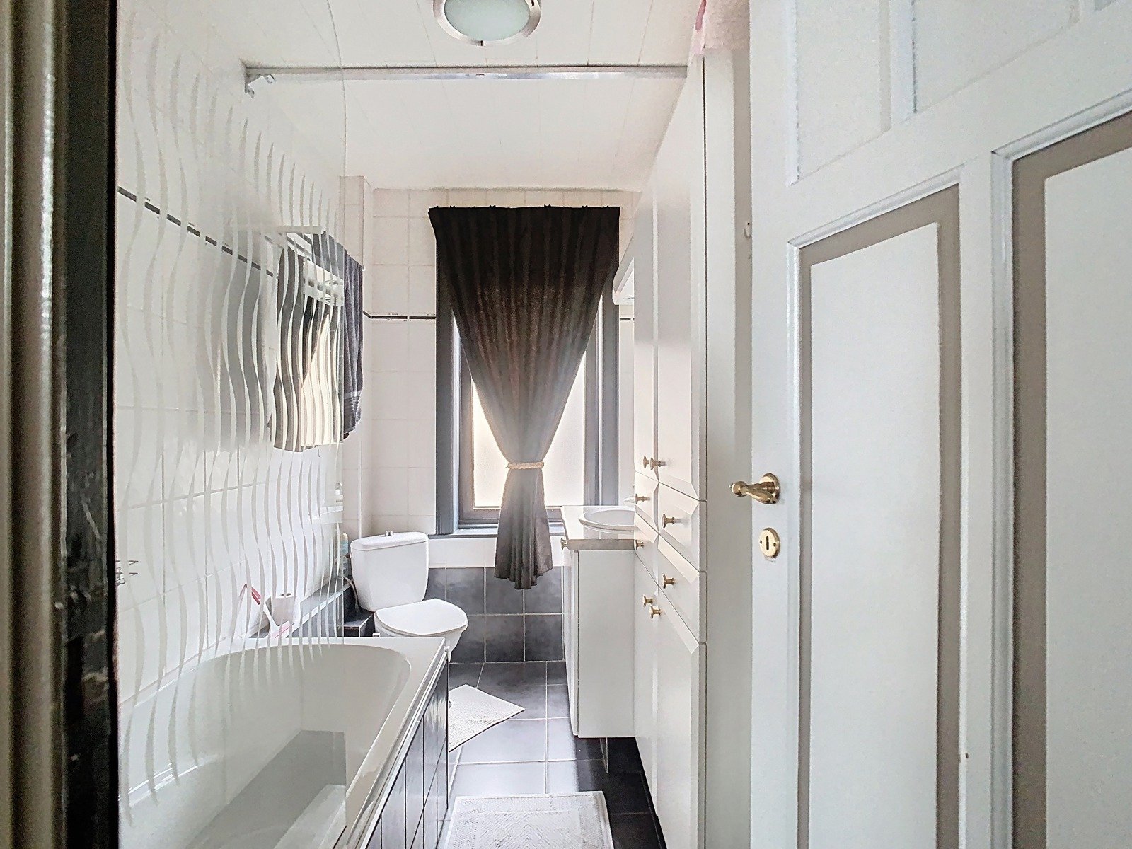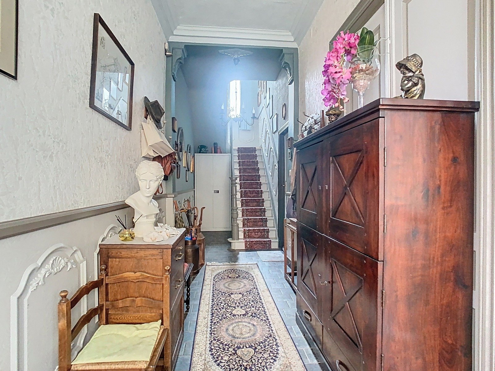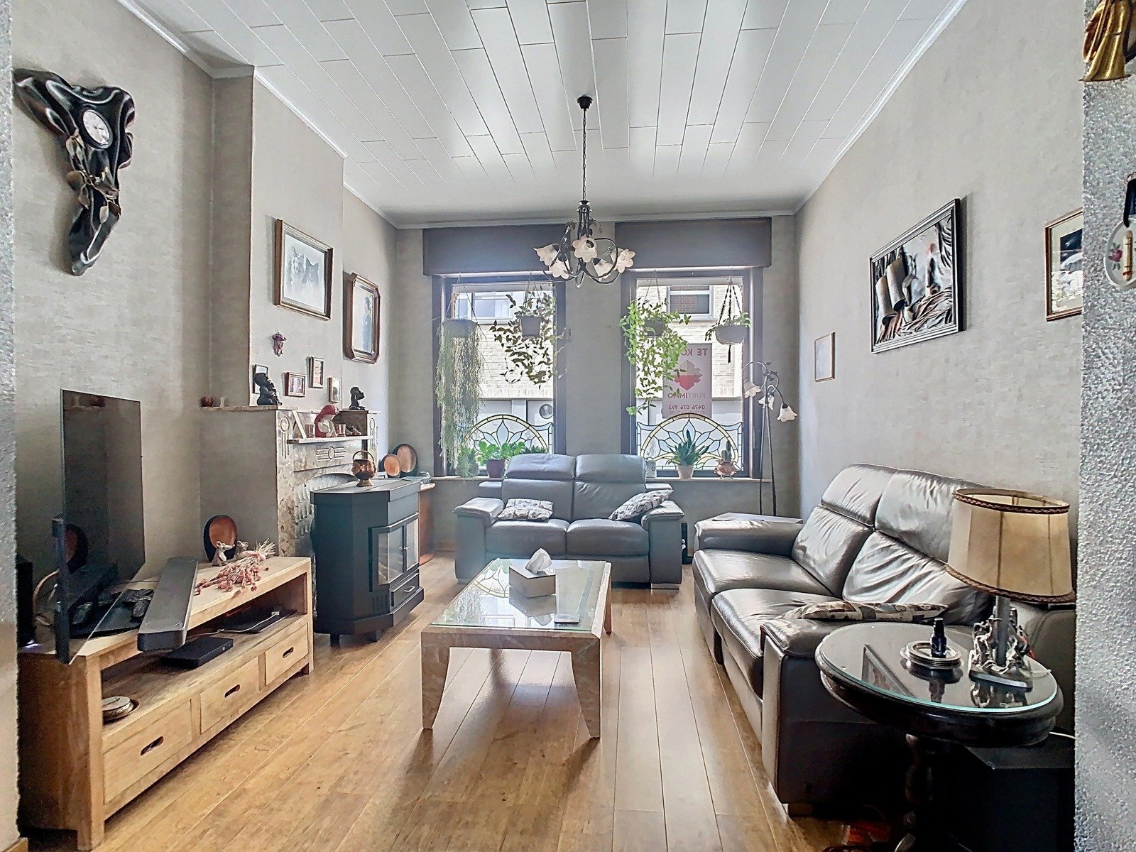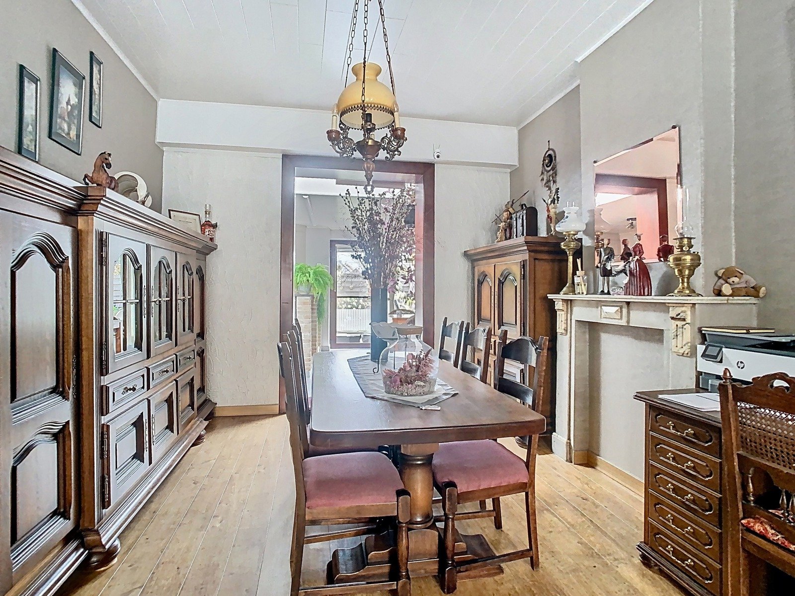 Bij het betreden van de woning word je verwelkomd in een indrukwekkende inkomhal met authentieke vloeren en hoge plafonds – een stijlvolle eerste indruk. Vanuit de inkomhal kom je in de sfeervolle leefruimte, die bestaat uit een lichtrijke zithoek, een gezellige eetkamer en een aparte bureauhoek – perfect voor thuiswerk of hobby’s.