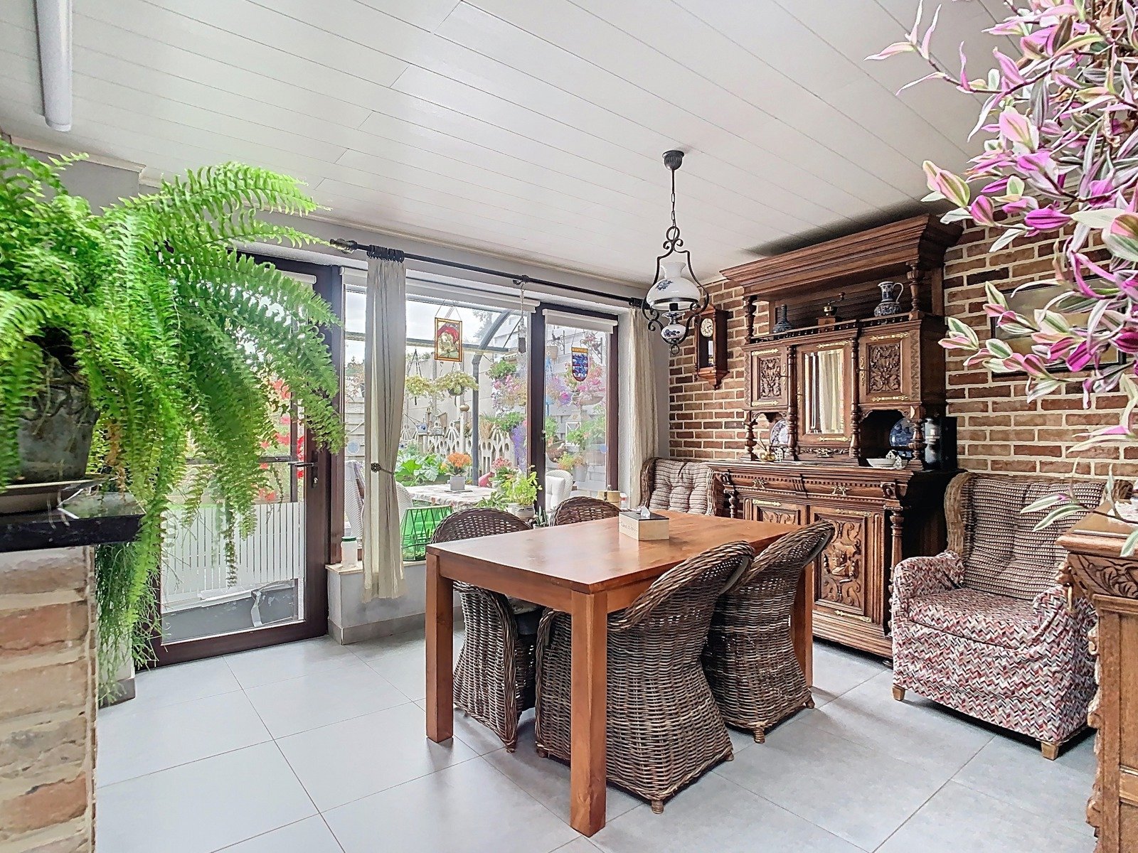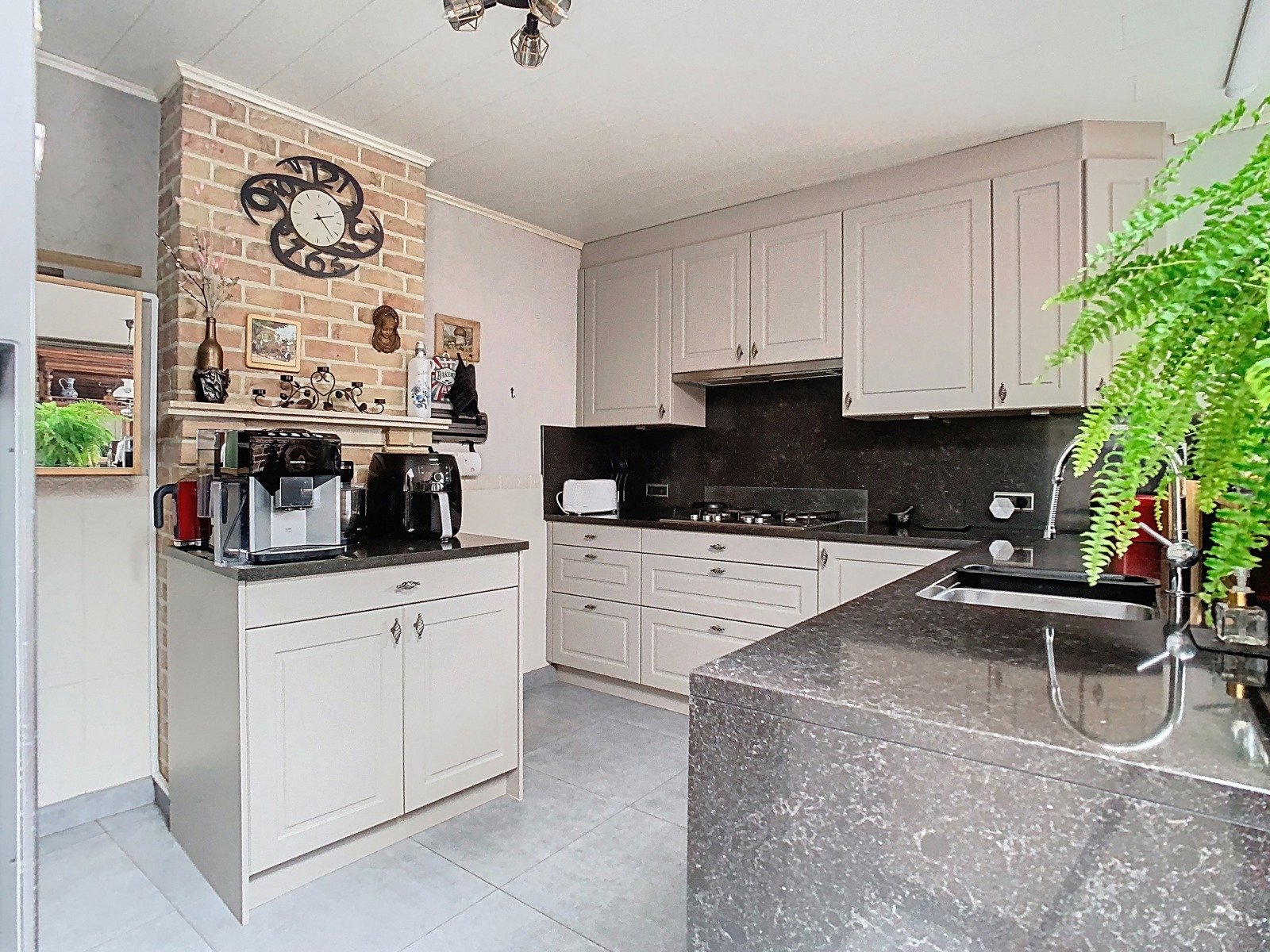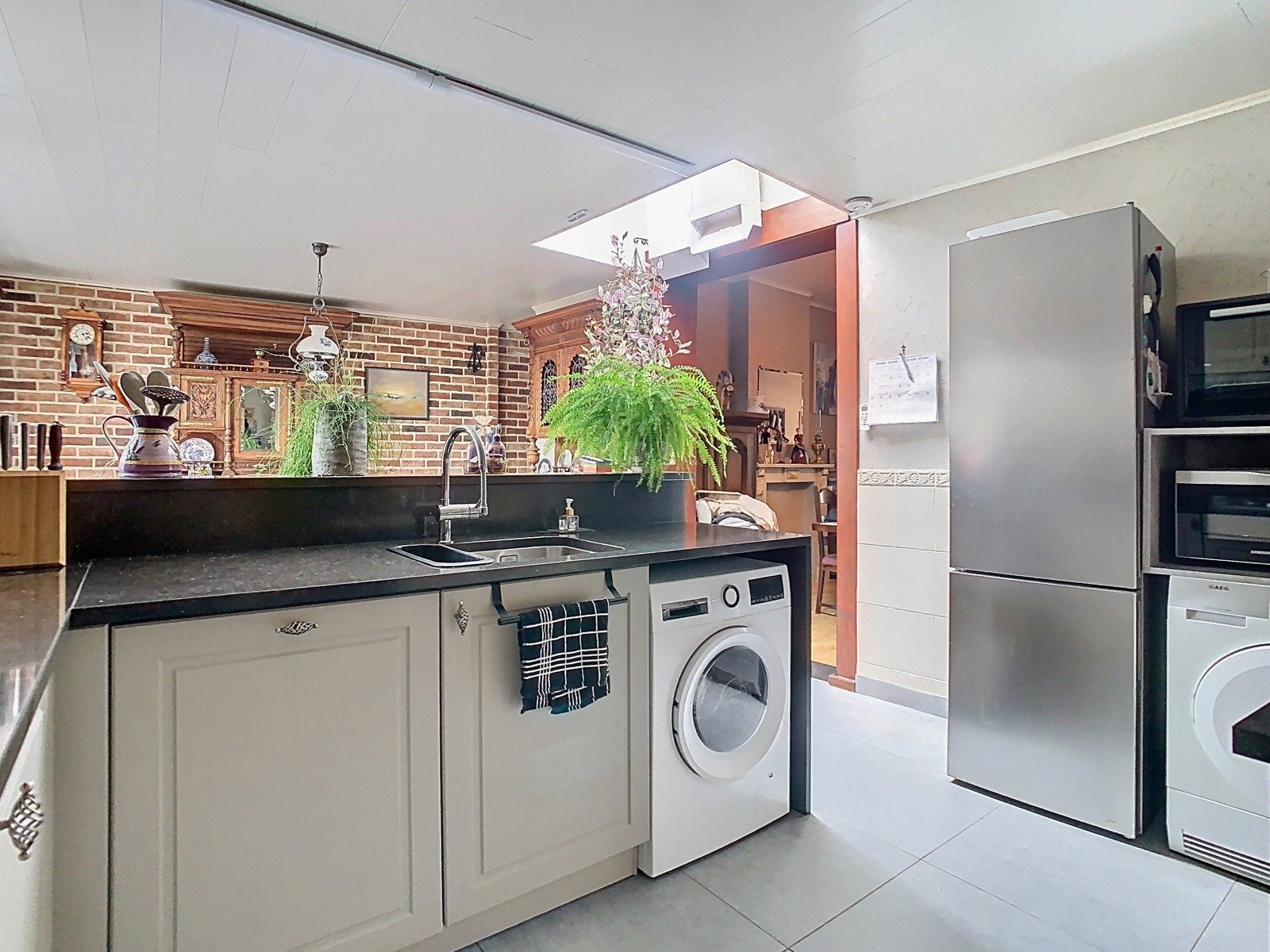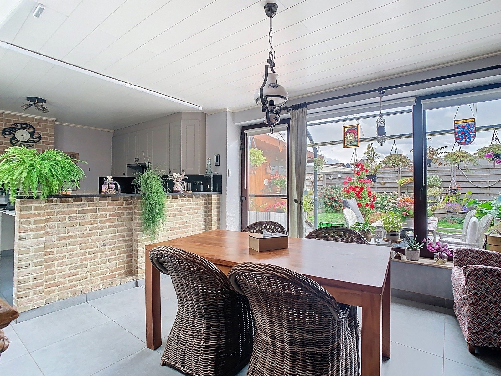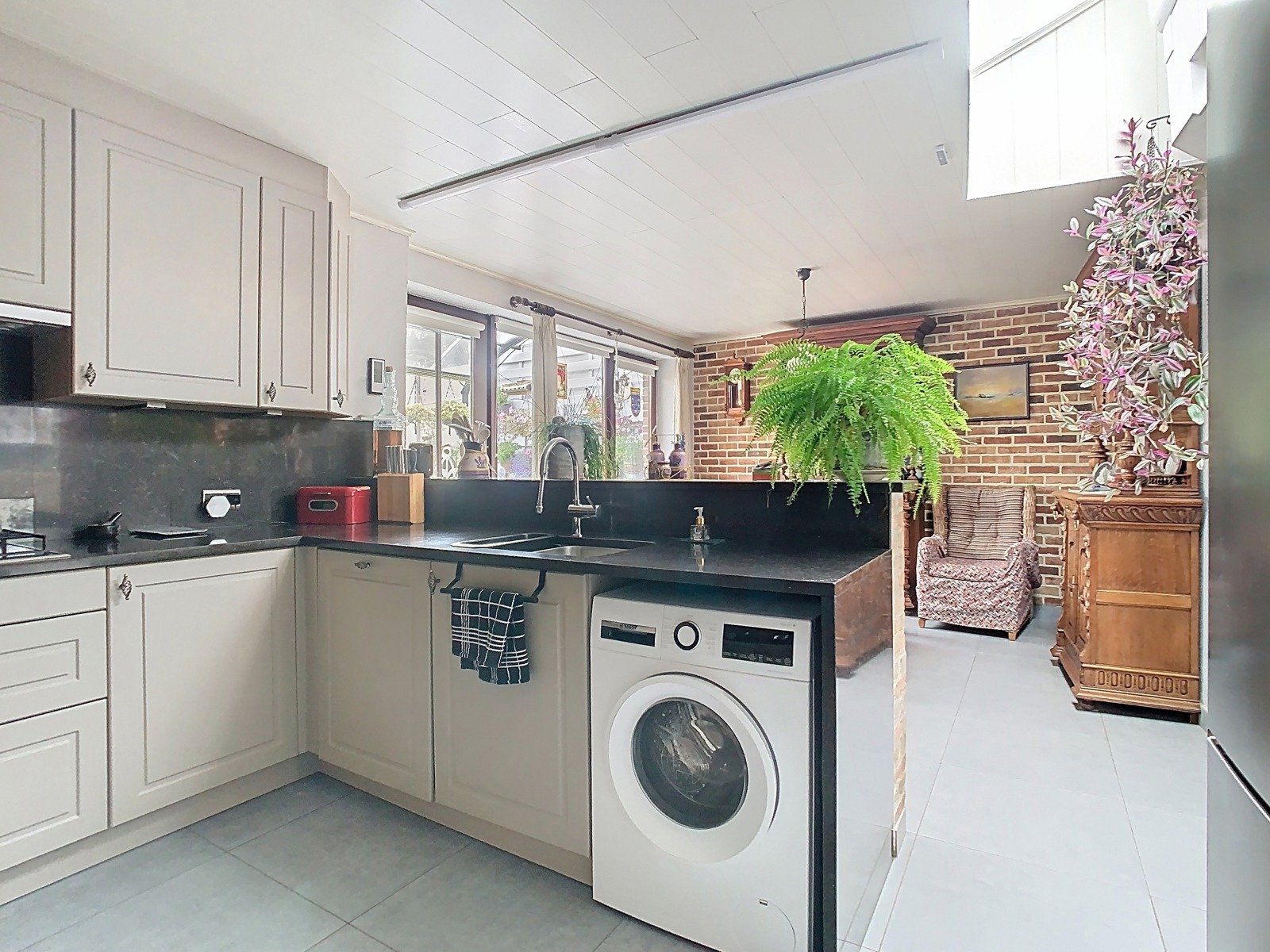 De open, volledig geïnstalleerde keuken sluit naadloos aan op de leefruimte. Ze is uitgerust met een praktische keukenblok én een uitnodigende ontbijthoek met zicht op het overdekte terras. Dit terras is een oase van rust, omringd door bloemen en groen – de ideale plek voor een koffie in de ochtend of een glas wijn in de avondzon.