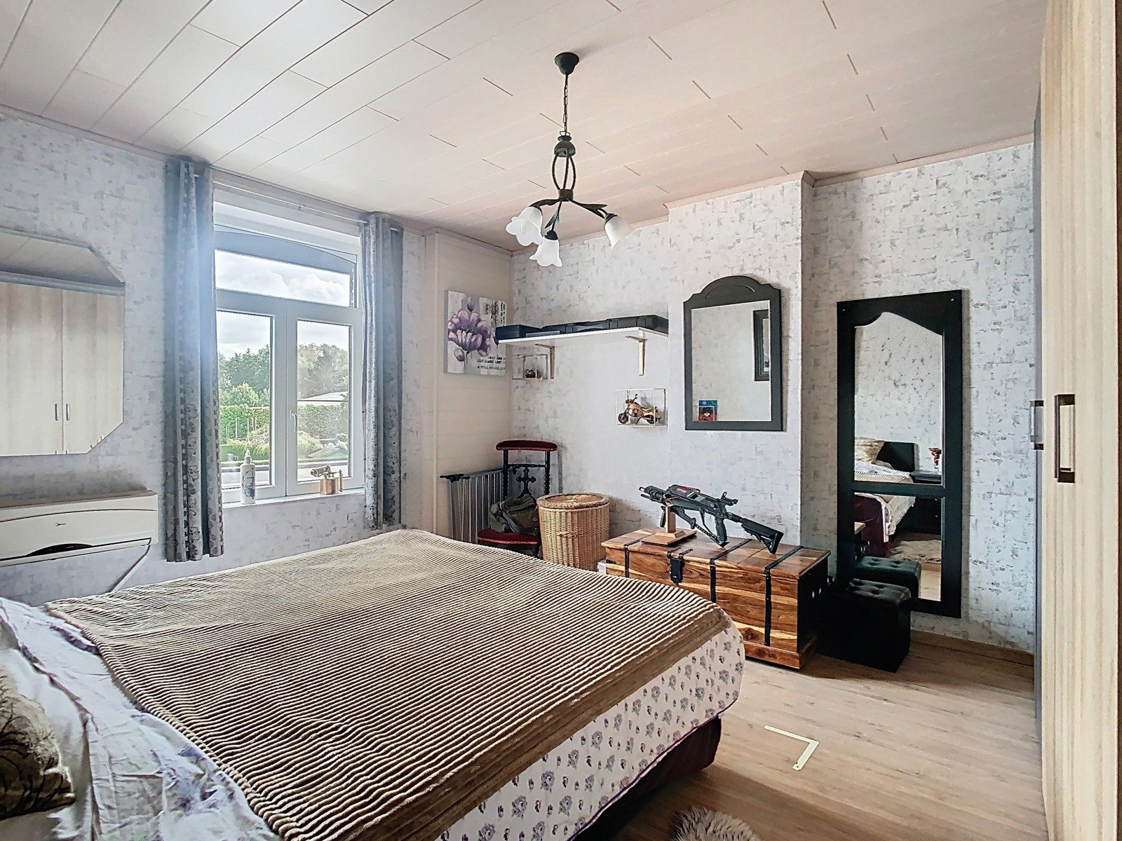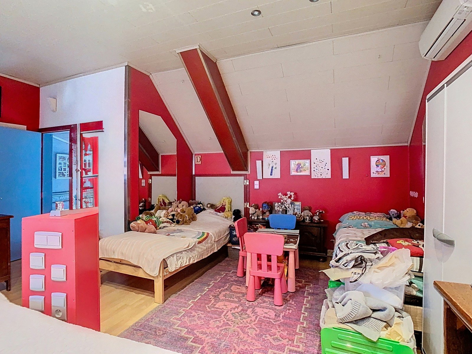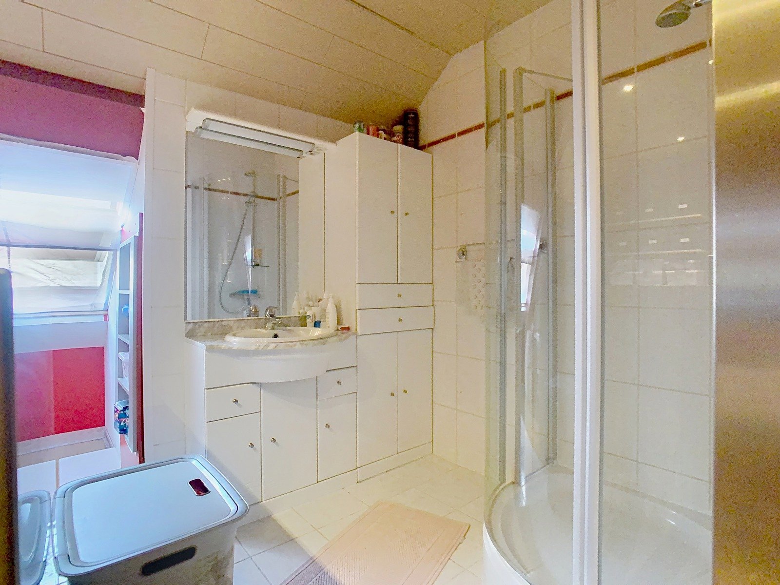 De zolderverdieping, bereikbaar via een vaste trap, is volledig ingericht als derde slaapkamer en vormt een volwaardige suite. Hier vind je ruimte voor een dubbel bed, extra slaapplaatsen of hobbyhoek, en een open badkamer met douche en lavabo – ideaal als master bedroom of gastenkamer.